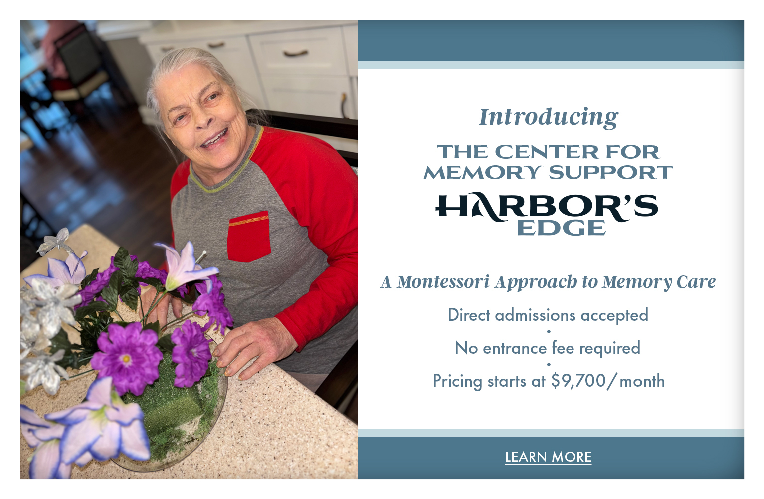 Harborās Edge Memory Support Center offers safe, secure and compassionate care to enable our residents to enjoy day-to-day living, stimulate their mental and physical focus, and encourage socialization. Our staff of experts are specially trained in Alzheimerās and dementia to offer the best care to memory support residents. Our C.A.R.E. approach to memory care encourages independence while catering to their special needs in a 24-hour supervised secure environment. LEARN MORE